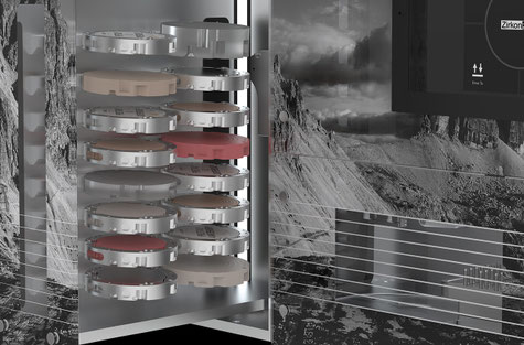 ミリングユニット本体はコンパクト設計でありながら、ブランクストレージは構成を柔軟に選択でき、最大16枚、または要件に応じて最大60枚/70枚/80枚まで管理できます。ストレージ内のディスクはソフトウェア上で監視・制御が可能です。インテリジェントなソフトウェアがディスクを最適なスロットへ自動で割り当てます(例:ドライ加工用ディスクを、ウェット加工中のディスクより上段に配置)。必要に応じて、割り当てを手動で行うこともできます。各スロットにはLEDステータス表示が組み込まれており、状態をひと目で確認できます。色によって、ディスクの挿入・取り出し、補正などの対応が必要かどうかを明確に示します。