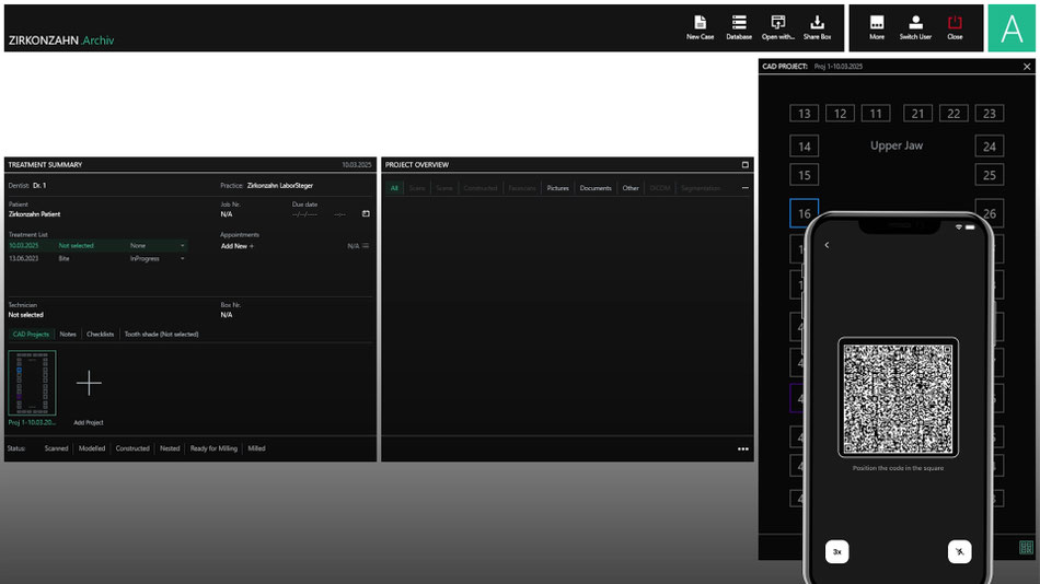 接続されたカメラを利用して、注文書や模型などの各種書類をデジタル化し、直接 Zirkonzahn.Archiv に保存できます。紙媒体の情報を効率的に管理し、データベースに一元化することで業務フローをスムーズにします。また、Zirkonzahn 製品に付属する QR コードをスキャンすることで、アイテム番号・ロット番号・製品種別を自動的にプロジェクトへ追加可能。入力の手間を省き、在庫や製品情報の管理をより正確かつ効率的に行えます。